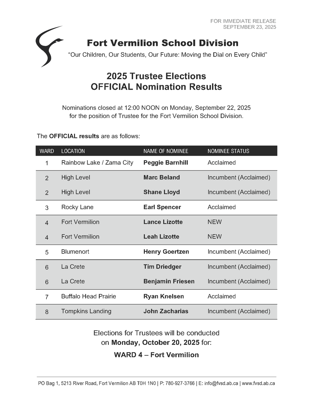 Candidates may submit their nomination papers at any time between the hours of 8:30 AM and 12:00 PM on Nomination Day, Monday, September 22, 2025 at FVSD Central Office, 5213 River Road, Fort Vermilion, AB. FVSD is divided into eight electoral wards or boundaries.
